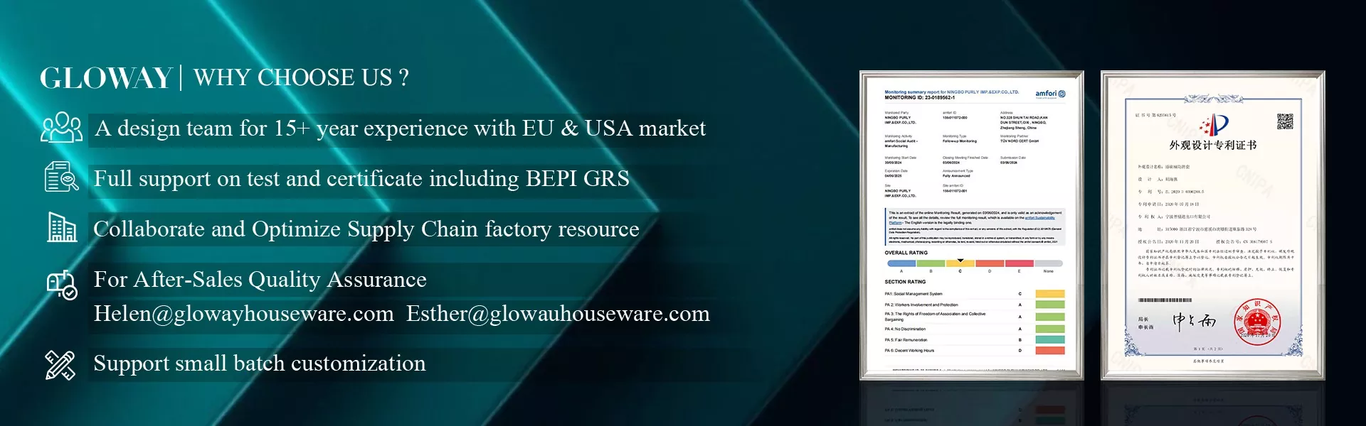 నింగ్బో పర్లీ ఇంప్. & ఎక్స్. కో., లిమిటెడ్ నింగ్బోలో మంచి ఎగుమతి వాతావరణాన్ని మరియు నింగ్బో సీ పోర్ట్కు అనుకూలమైన ట్రాఫిక్ను ఆస్వాదిస్తోంది. 3000 m² మరియు I S O 9 0 0 1 మరియు B S C I సర్టిఫికెట్తో, మీకు అవసరమైన ఏదైనా ఫ్యాక్టరీ ఆడిట్ అవసరాలను మేము తీర్చవచ్చు.