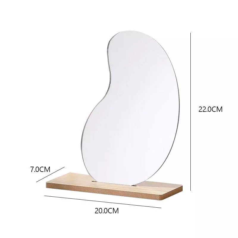 ఈ క్రమరహిత ఉంగరాల టేబుల్టాప్ మిర్రర్లో మినిమలిస్ట్, కళాత్మక సిల్హౌట్ ఉంది, ఇది ఆధునిక గృహాలంకరణతో సజావుగా మిళితం అవుతుంది. హై-డెఫినిషన్ క్లియర్ గ్లాస్ మరియు మృదువైన చెక్క బేస్తో రూపొందించబడింది, ఇది మేకప్ అప్లికేషన్, స్కిన్కేర్ రొటీన్లు మరియు రోజువారీ వస్త్రధారణకు అనువైన వక్రీకరణ-రహిత ప్రతిబింబాన్ని అందిస్తుంది.