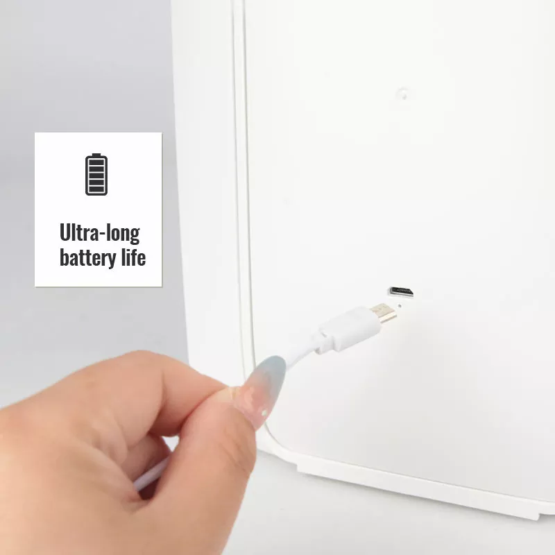 అంతర్నిర్మిత పునర్వినియోగపరచదగిన బ్యాటరీతో ఆధారితం, ఈ అద్దం USB-C ఫాస్ట్ ఛార్జింగ్కు మద్దతు ఇస్తుంది మరియు పొడిగించిన ఉపయోగం కోసం అల్ట్రా-లాంగ్ బ్యాటరీ జీవితాన్ని అందిస్తుంది. తరచుగా రీఛార్జ్ చేయవలసిన అవసరం లేదు, ఇది రోజువారీ గృహ వినియోగం మరియు సుదీర్ఘ పర్యటనలు రెండింటికీ నమ్మదగినదిగా చేస్తుంది. శక్తి-సమర్థవంతమైన LED డిజైన్ విద్యుత్ వినియోగాన్ని కూడా తగ్గిస్తుంది.
