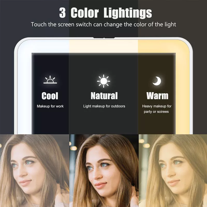 3 లైట్ మోడ్ల ద్వారా సైకిల్ చేయడానికి బటన్ను పదేపదే నొక్కండి: కూల్ (వర్క్ మేకప్), నేచురల్ (అవుట్డోర్ మేకప్) మరియు వార్మ్ (సాయంత్రం/పార్టీ మేకప్).